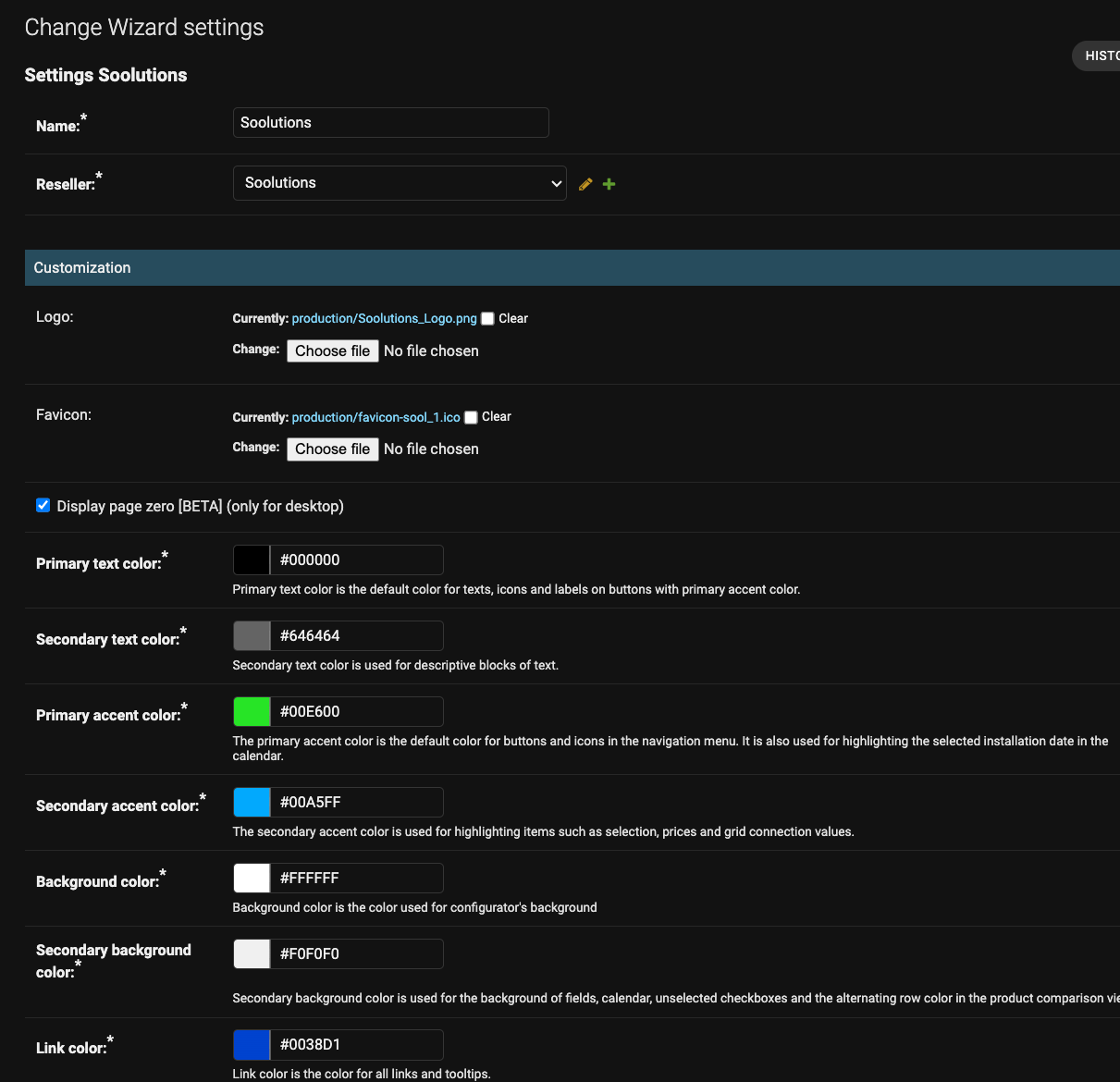 Within the "Wizard Settings" menu, you have the flexibility to customize each Wizard by selecting its logo and favicon, choosing the color scheme that best represents your brand, and inputting the company information that will be utilized for that specific Wizard.